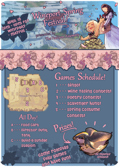 Come celebrate the spring season in full swing with the Halcyon Assembly! Enjoy a full day of roleplay, games, prizes, food and of course, Wineport's very best wines! Check our flyer for more info!